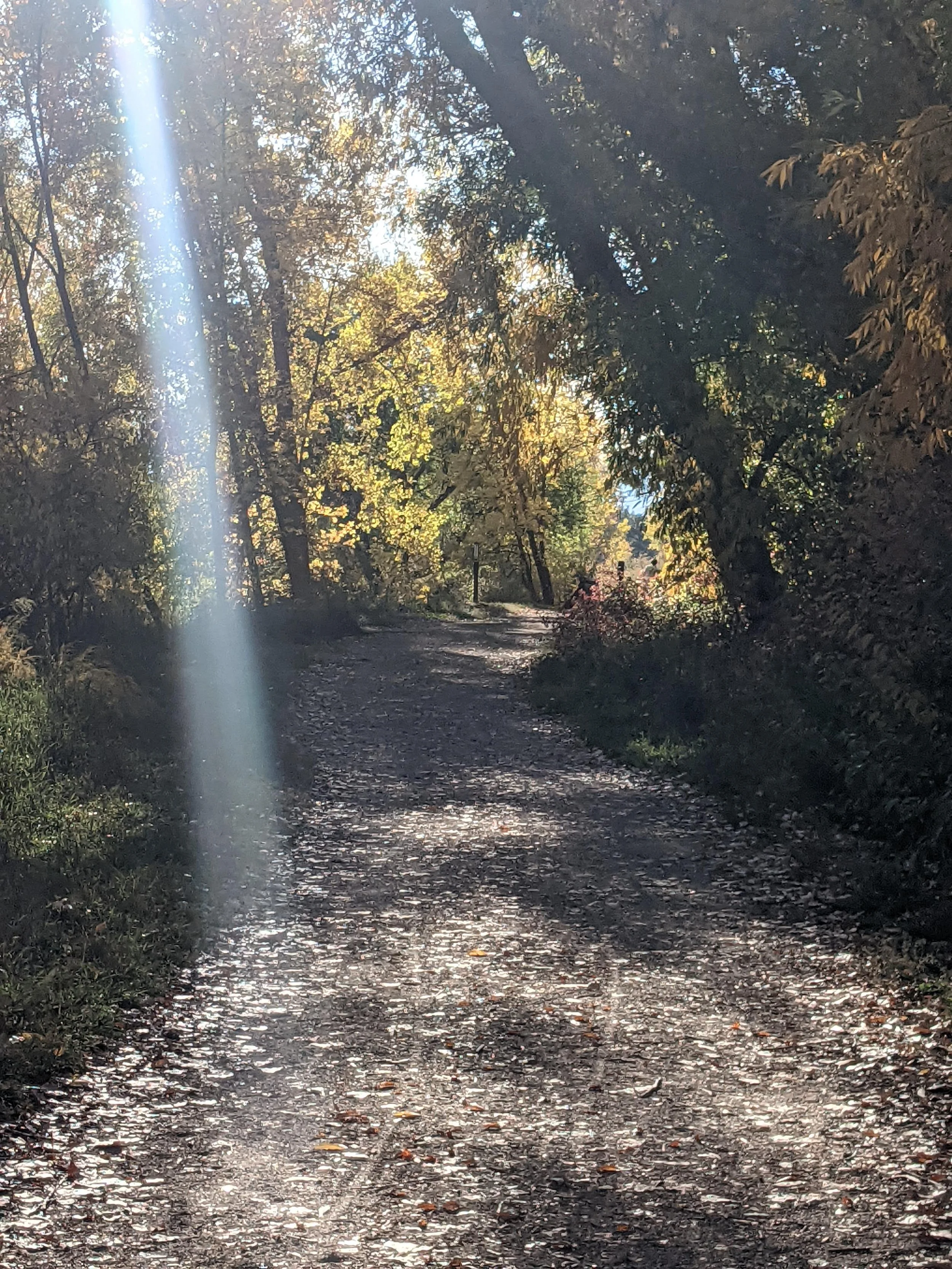 A dirt path in a forest with trees on both sides, autumn leaves on the ground, and sunlight filtering through the branches.